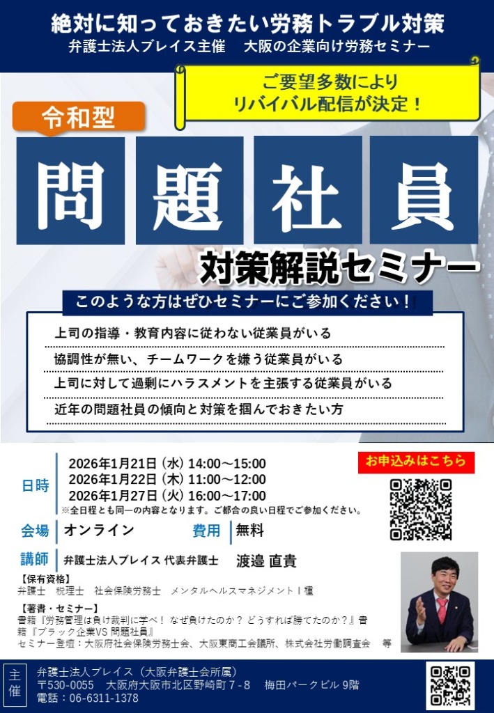 ご要望多数により、下記日程にて、「令和型 問題社員対策解説セミナー」をリバイバル配信いたします。